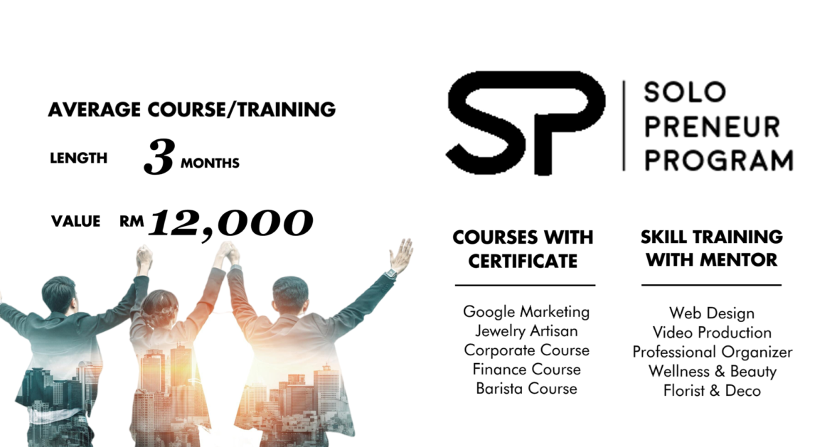 Enroll in our Solo-Preneur Program (SPP) for FREE 3-months courses (valued at RM12,000 averagely), complete with a qualified certificate or skills to transform your career and life.